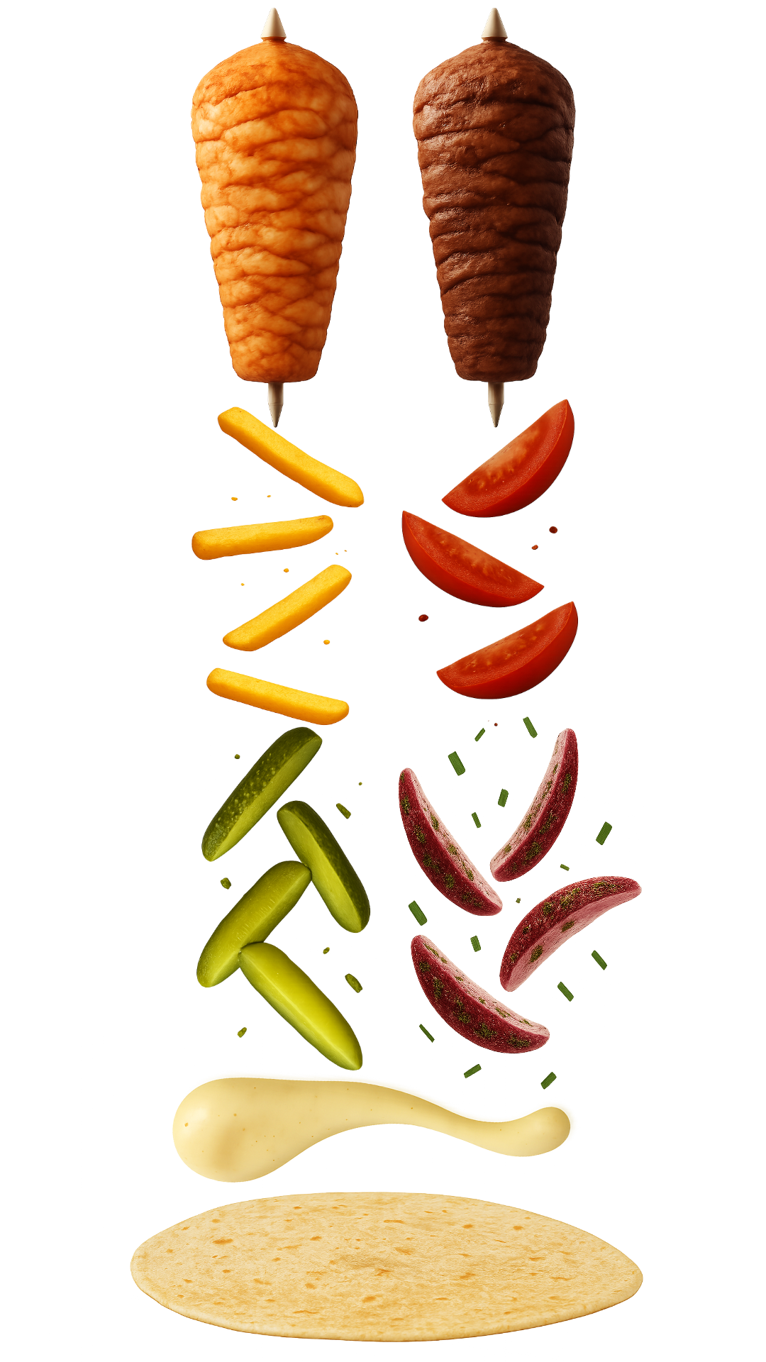 Fresh, marinated meat slow-cooked to perfection on a vertical rotisserie.
